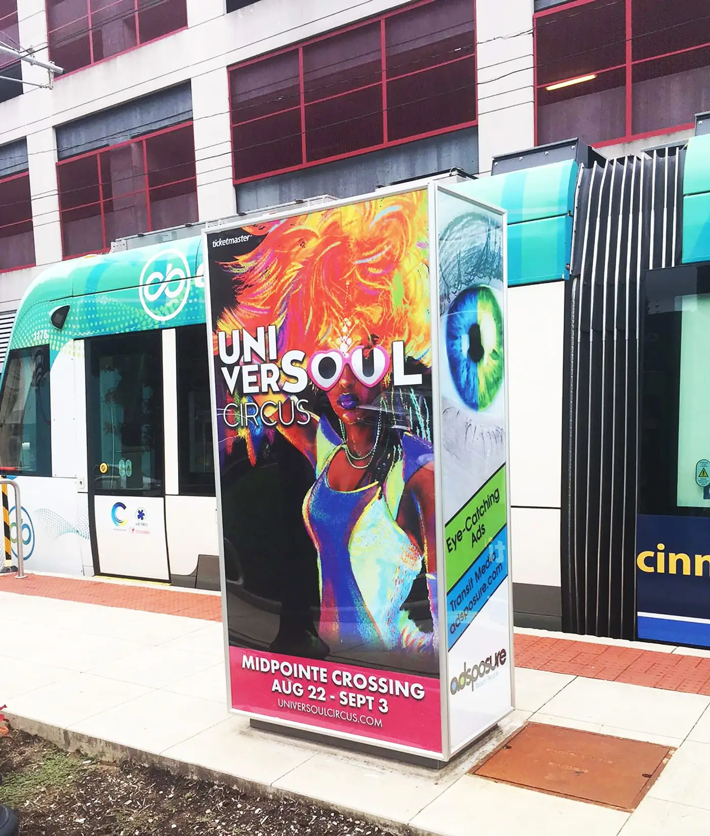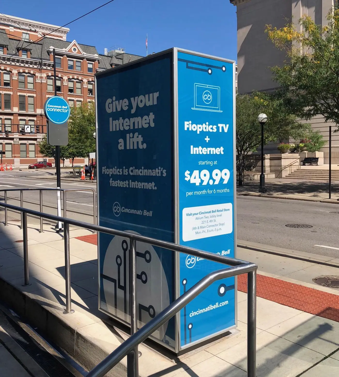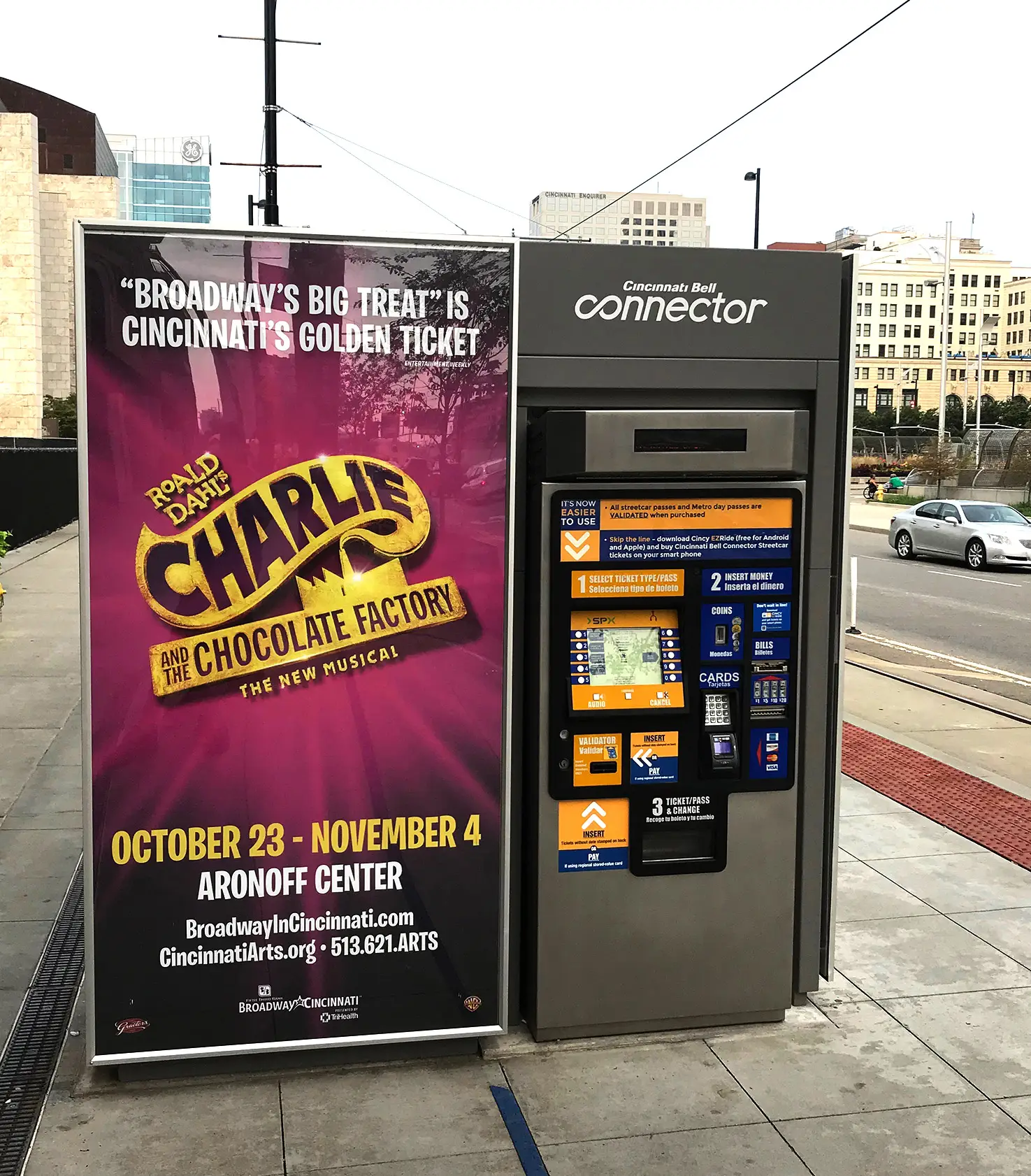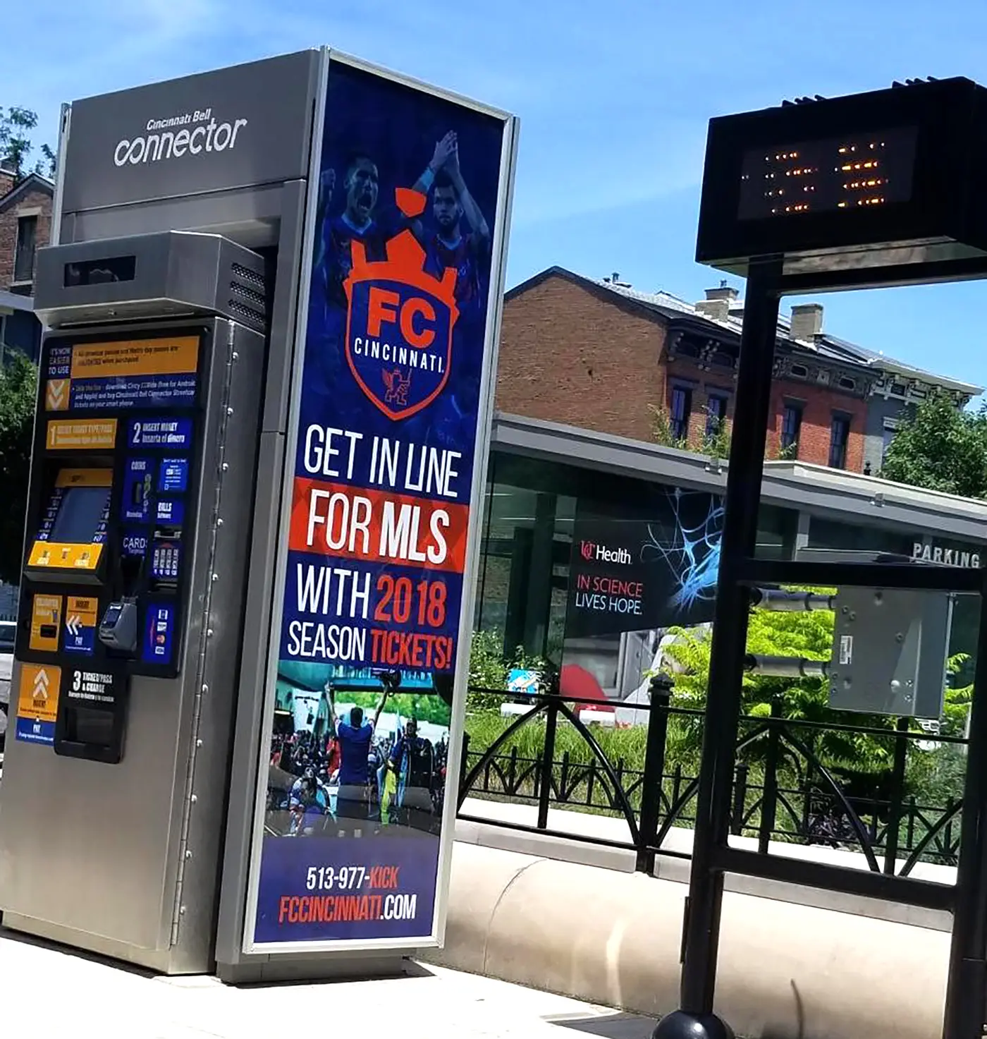 Cincinnati Ticket Kiosk advertising is a unique opportunity that puts you right in the action. Be seen in key hotspots along routes travelled by the Cincinnati Bell Connector.